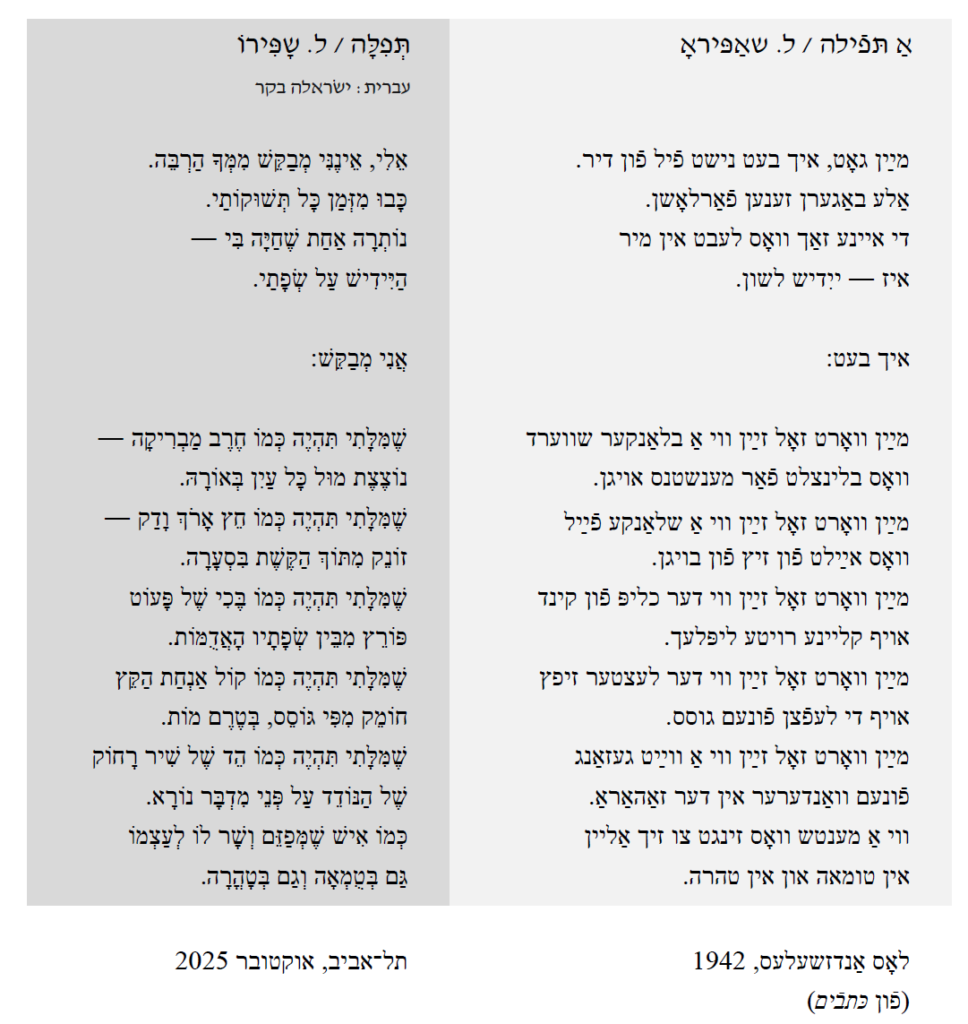 היום יום הולדת (10 במרץ) לסופר המדהים ל’ שפירא, וישראלה בקר המשתתפת בסדנת התרגום שלנו ומפליאה לתרגם מיידיש לעברית הפשילה שרוולים בממ”ד ושלחה לנו את התרגום הנהדר לשיר-תפילה שכתב על שפתו-שפתנו האהובה. תענוג!
