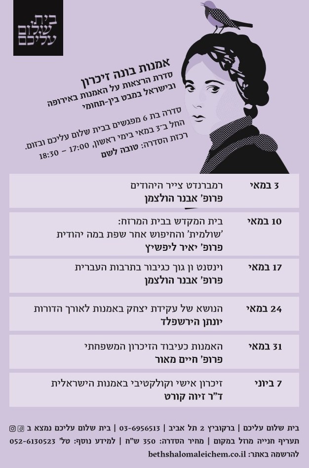אמנות בונה זיכרוןסדרת הרצאות על האמנות באירופה ובישראל במבט בין-תחומי ימי א' 18:30-17:00 בית שלום עליכם, רח' ברקוביץ' 2, תל אביב הסדרה תועבר גם בזום רכזת הסדרה: טובה לשם להרשמה
